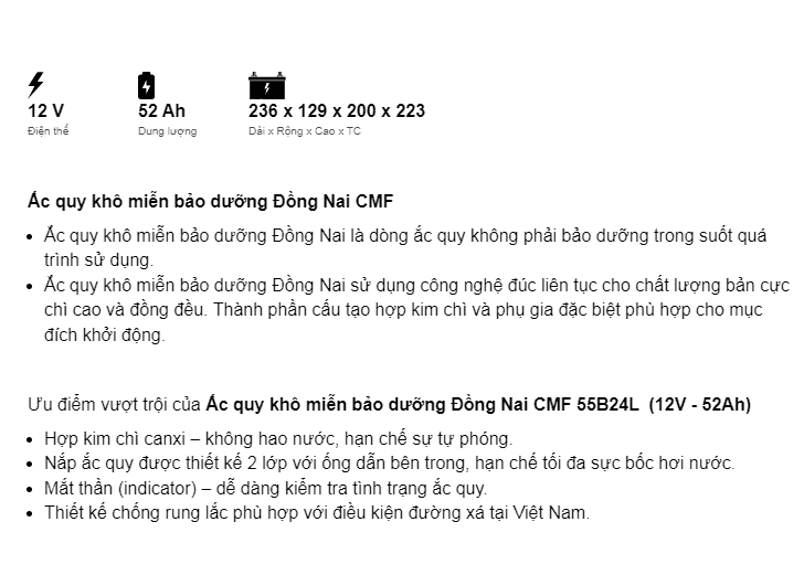 Dòng CMF là ắc quy miễn bảo dưỡng (ắc quy khô, kín) của Đồng Nai đảm bảo về chất lượng cũng như giá thành sản phẩm. Ắc quy làm từ hợp kim chì canxi có bổ sung thiếc, bạc nhập khẩu từ Úc nên không hao nước, hạn chế sự tự phóng điện. Nắp bình được thiết kế 2 lớp với ống dẫn bên trong, giúp giảm tối đa sự bốc hơi nước. Trong bình trang bị bộ phận lọc chống bắt lửa – an toàn khi sử dụng và Indicator (mắt thần) – dễ dàng kiểm tra tình trạng ắc quy.