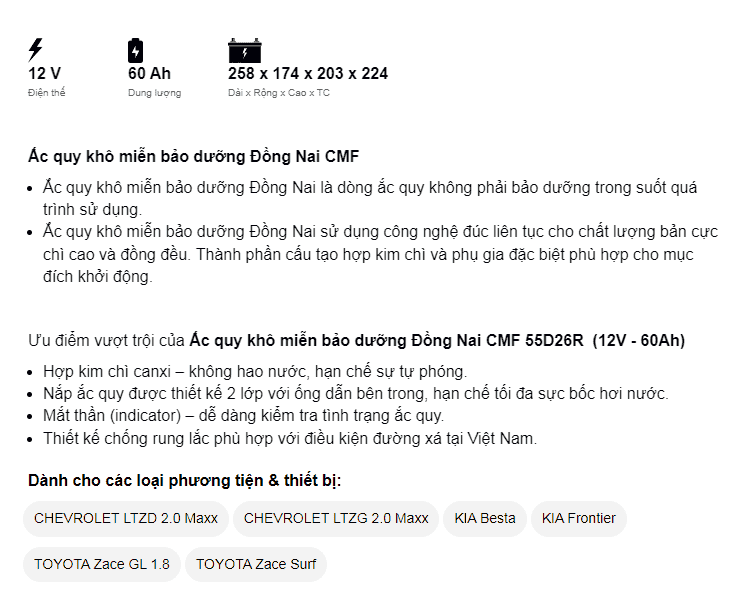 Dòng CMF là ắc quy miễn bảo dưỡng (ắc quy khô, kín) của Đồng Nai đảm bảo về chất lượng cũng như giá thành sản phẩm. Ắc quy làm từ hợp kim chì canxi có bổ sung thiếc, bạc nhập khẩu từ Úc nên không hao nước, hạn chế sự tự phóng điện. Nắp bình được thiết kế 2 lớp với ống dẫn bên trong, giúp giảm tối đa sự bốc hơi nước. Trong bình trang bị bộ phận lọc chống bắt lửa – an toàn khi sử dụng và Indicator (mắt thần) – dễ dàng kiểm tra tình trạng ắc quy.