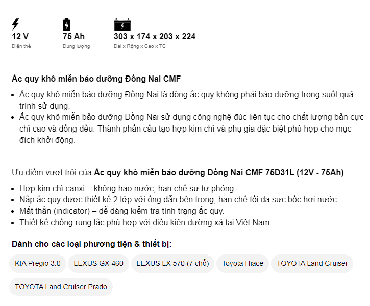 ẮC QUY ĐỒNG NAI PINACO 12V-75Ah (CMF75D31)