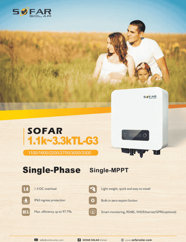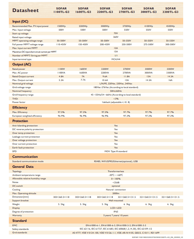 Thông số kỹ thuật INVERTER HÒA LƯỚI SOFAR SOLAR 3KW (3000TL-G3)