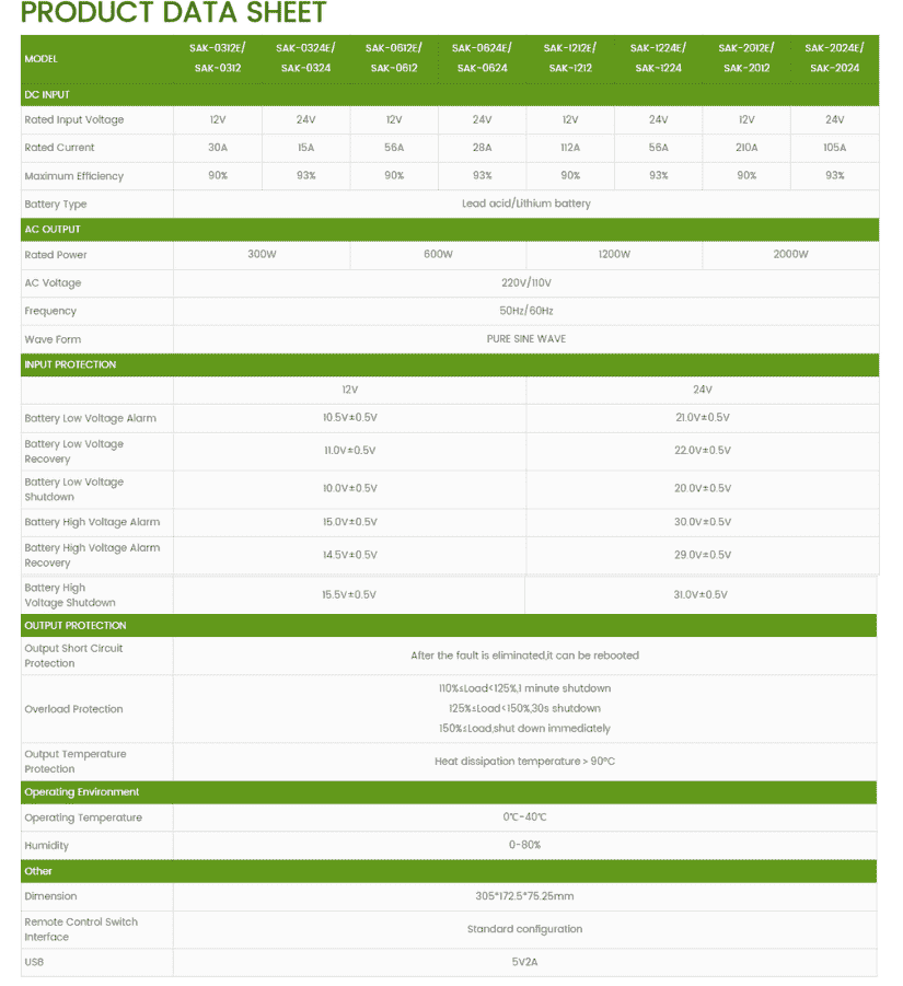 Thông số kỹ thuật Inverter Kích Điện Sin Chuẩn Sumry 2000W – 24V