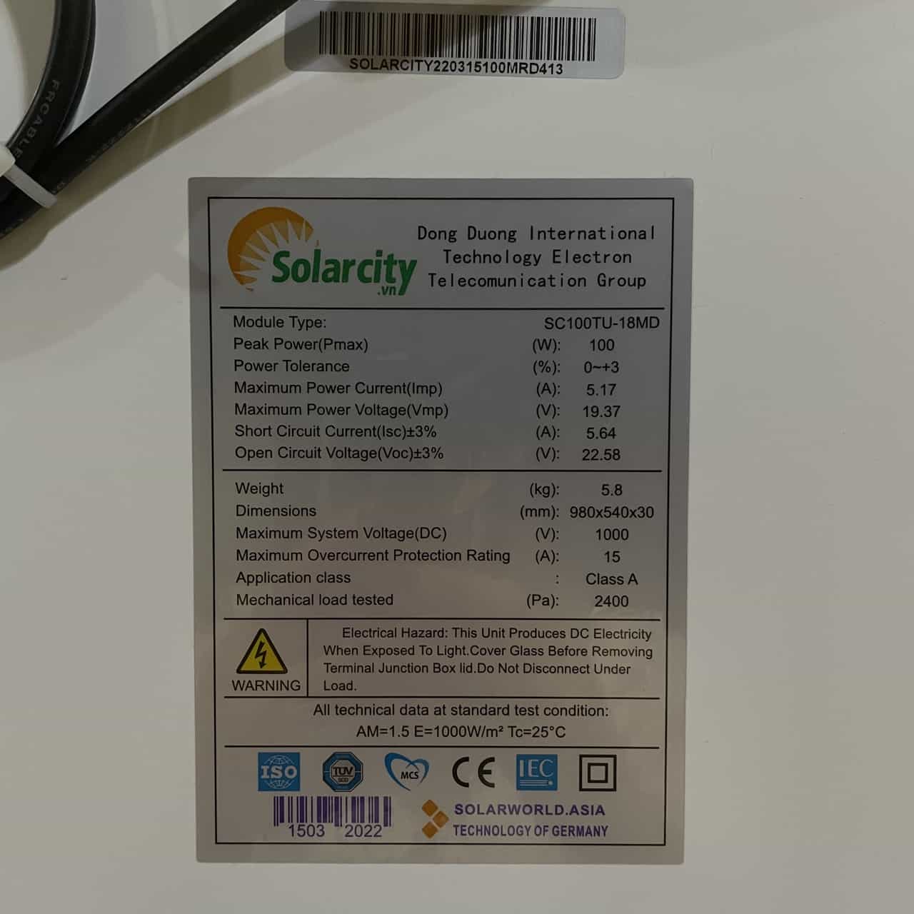 Thông số kỹ thuật TẤM PIN NĂNG LƯỢNG MẶT TRỜI MONO 100W SOLARCITY